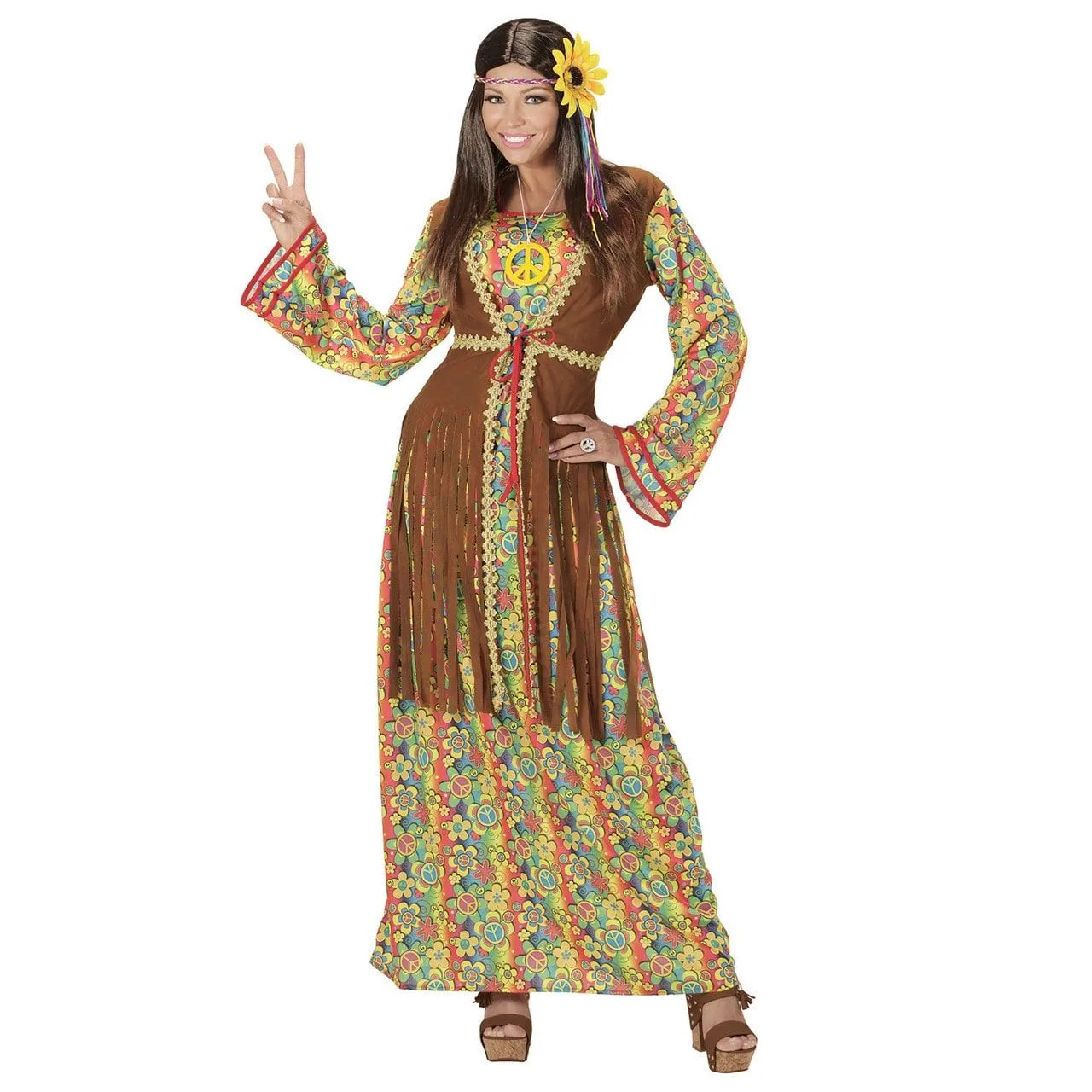In deze kleding kan je zo meedoen in de musical Hair. De lange bedekkende jurk met psychedelische bloemenprint in vrolijke pasteltinten zit comfortabel als je in trance aan het dansen bent. Het bruine vest is met franjes afgewerkt en met een lint dicht te knopen. Je bent geen echte hippie zonder ketting met het vredesteken, draag deze met trots en liefde! Hippies liepen meestal op blote voeten, dus laat die schoenen maar thuis. Alle burgerlijkheid overboord , op het flowerpower feest kijkt niemand er van op als je een beetje experimenteert met geestverruimende middelen en de vrije liefde. Dat lekkere ding in zijn jaren 60 & 70 pak lijkt jou wel te zien zitten. Logisch, je bent het leukste bloemenmeisje van allemaal!