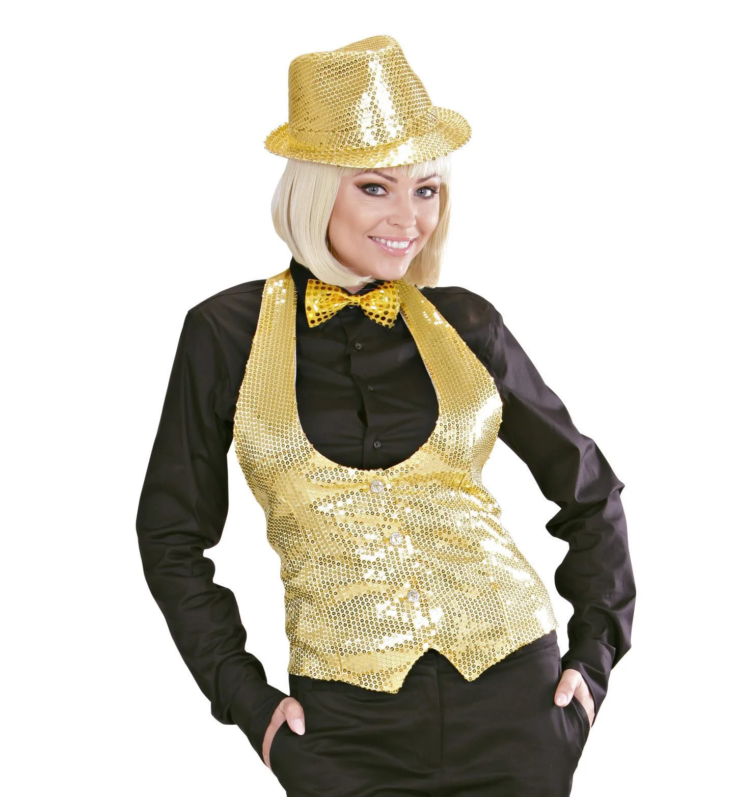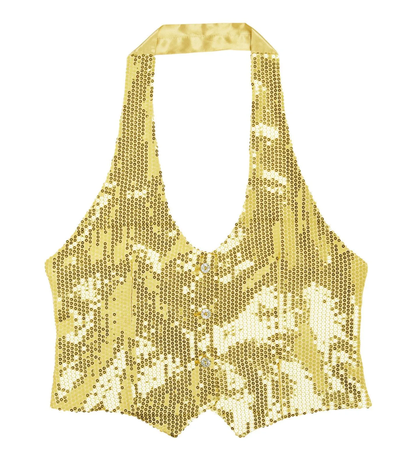 Ook vrijgezellenavonden voor een huwelijk of verjaardagen krijgen veel meer glitter & glamour wanneer je dit schitterende gouden pailletten damesvest aantrekt onder je kleding