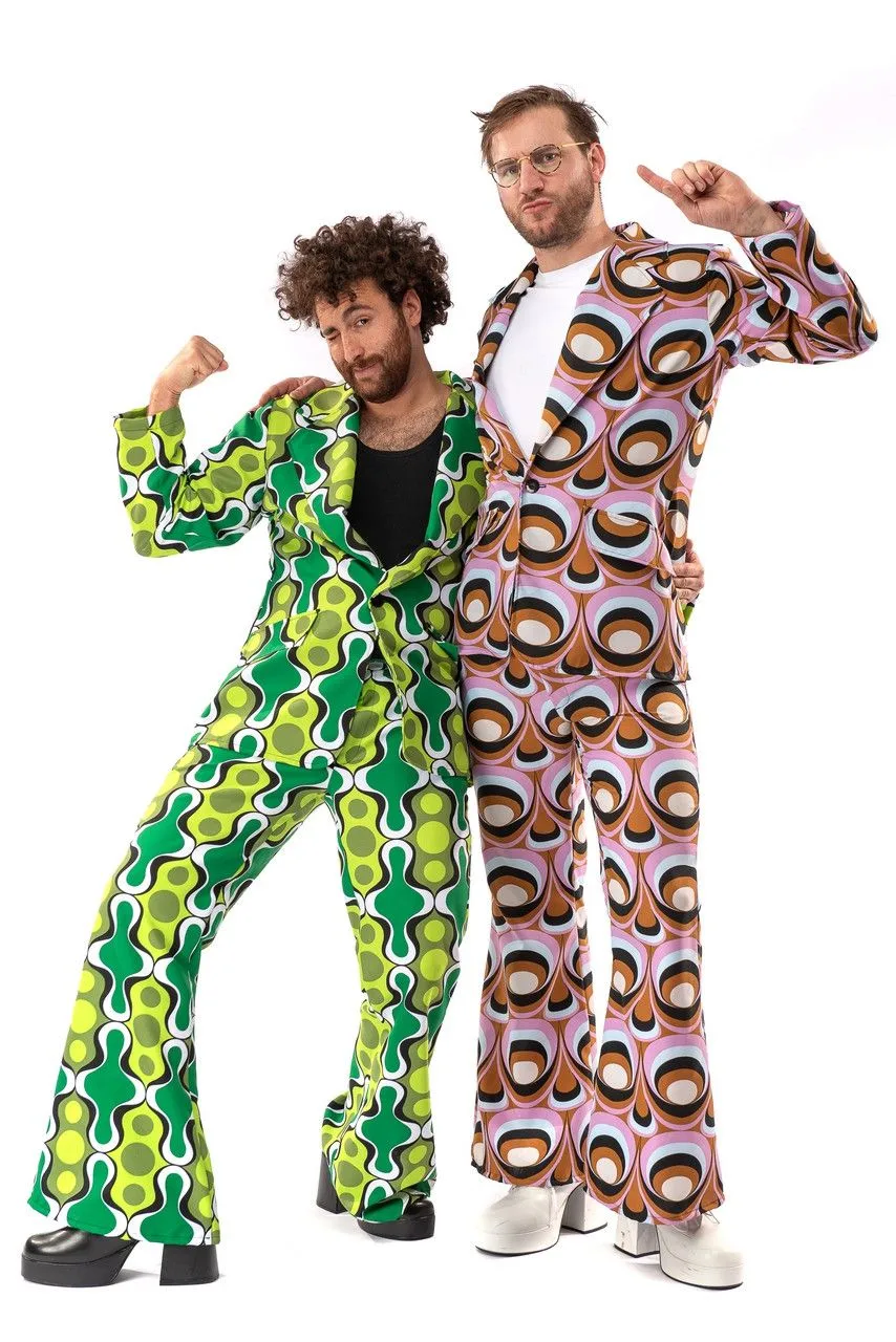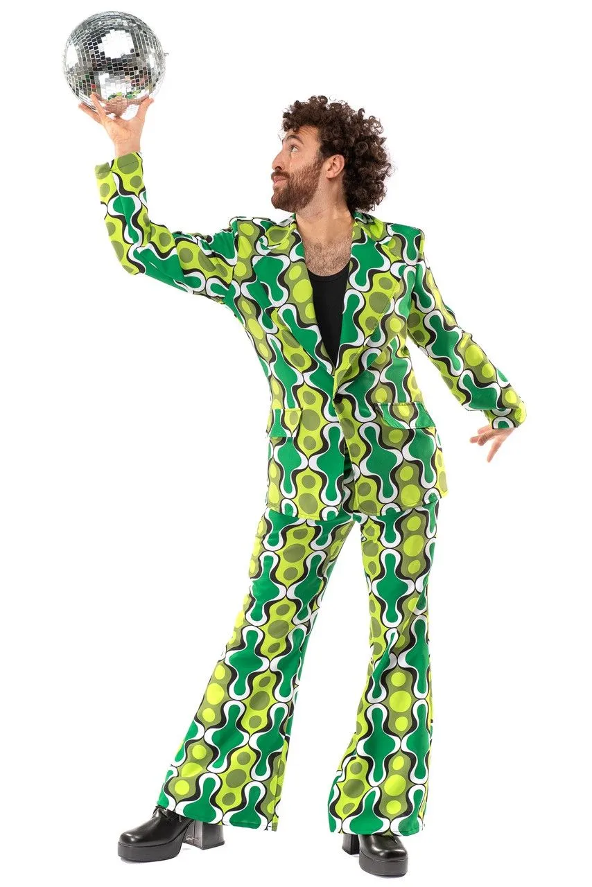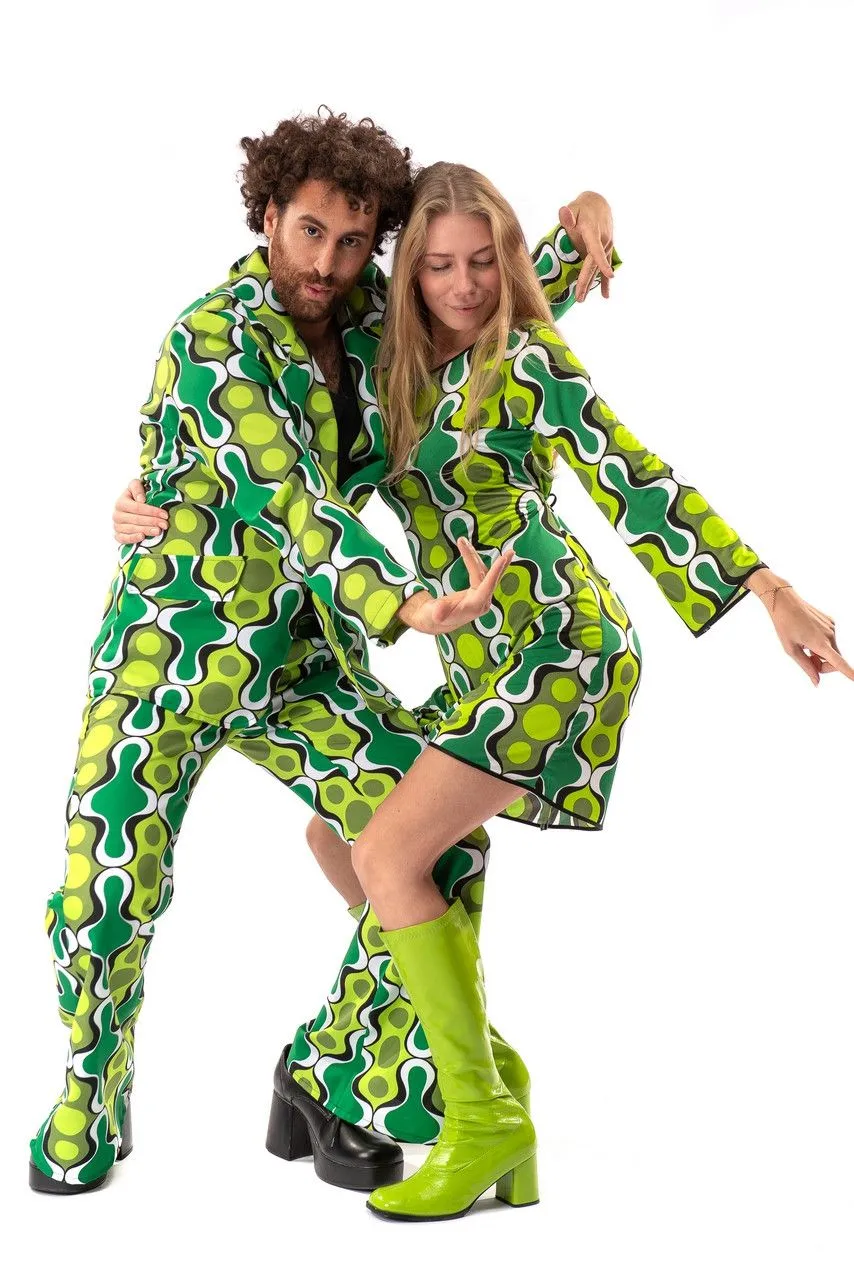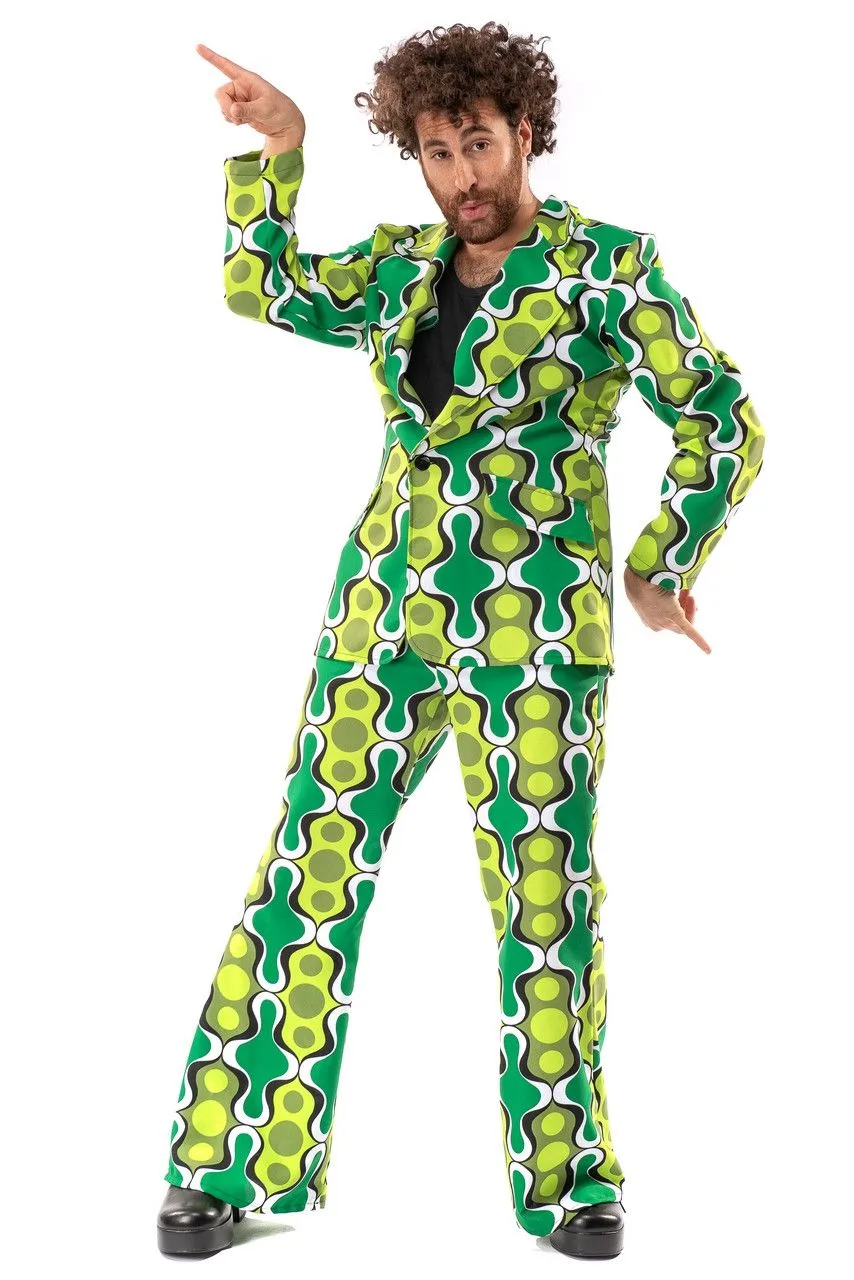 Terug naar de jaren 60 & 70 op het disco feest, dan maak jij een spectaculaire entree in je groene jaren 70 hippie soul disco herenpak! Het gifgroene psychedelische cirkels en stippenpatroon hebben een hypnotiserende invloed op de andere feestgangers. Vooral op die leuke daar, in haar korte Flower Power kleding. Samen even de bloemetjes buiten zetten?