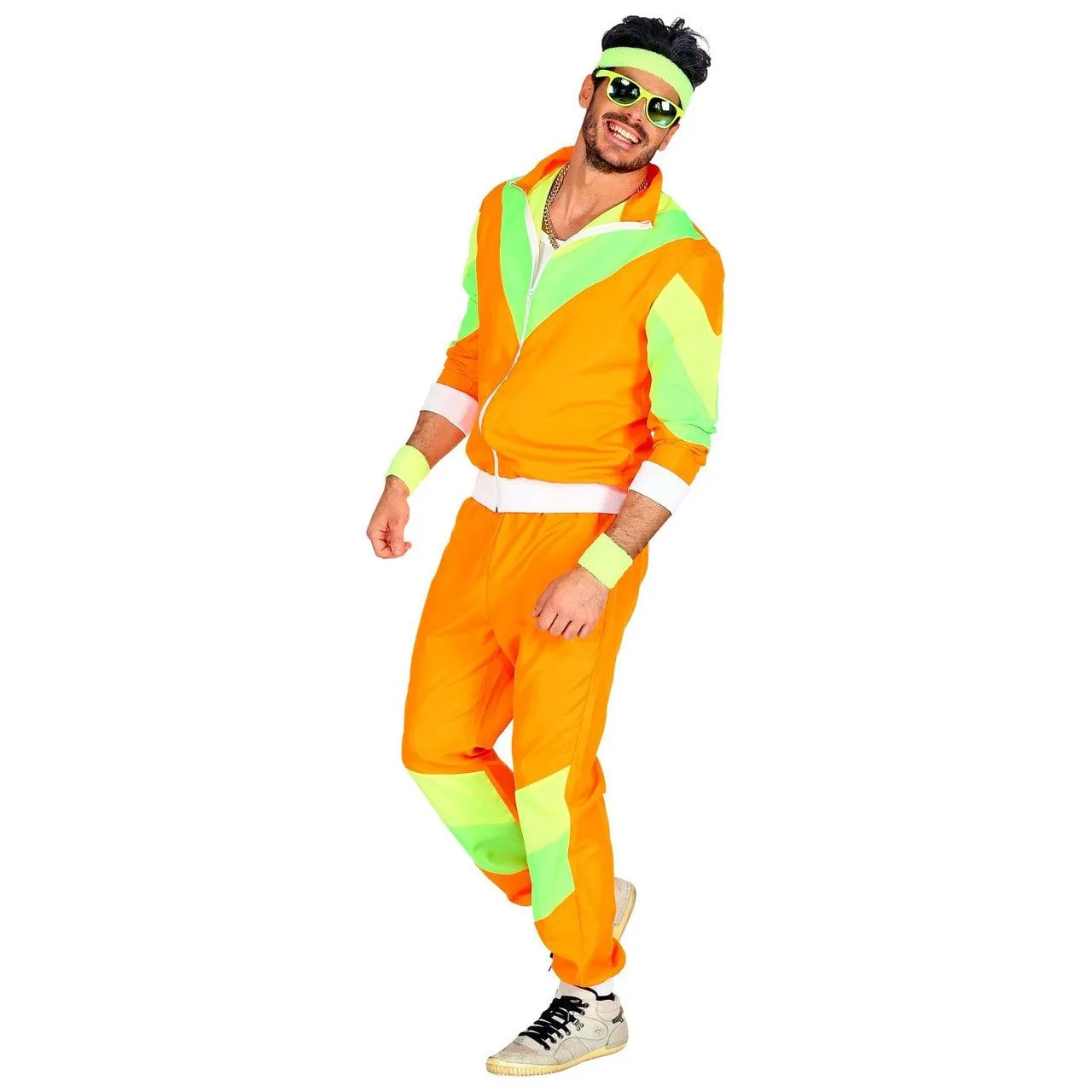 Als jij wel van een beetje opvallen houdt, dan is dit kostuum natuurlijk iets voor jou. In de jaren 80 & 90 waren deze kleuren geen uitzondering, iedereen droeg hippe felgekleurde trainingspakken om vervolgens de mooiste dansmoves te showen. Reken er maar op dat jij de aandacht trekt in dit pak. Al vind je dat natuurlijk niet erg, al helemaal niet wanneer het de aandacht van de dochter van Ma Flodder is op dat foute aso feest.