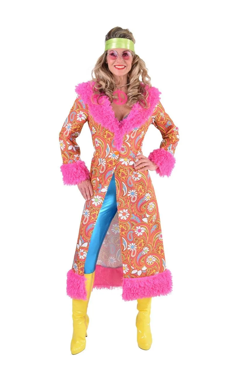 Zelfs op het Hippie Festival van de liefde kunnen de avonden koud zijn. Dus ga jij goed voorbereid op pad! Over je ultrakorte jaren 60 & 70 kleding draag jij je vrolijke roze Afghaanse jaren 70 paisley bloemen damesjas met (nep)bont. Zo heb je niemand nodig om je warm te houden!